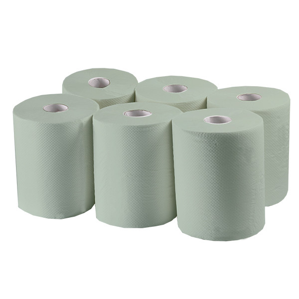 Hand towel rolls are made of recycled paper. Raw material has high absorbing properties which in turn leads to economic use. Hand towels has a core and perforation. The big size of the roll allows you to use it for a long time.