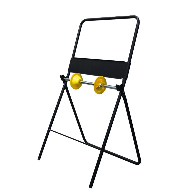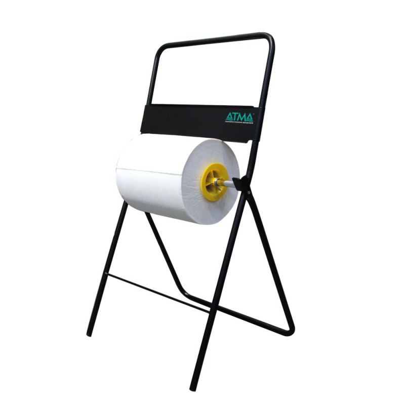 E-Line paper roll holder. This floor holder is used for industrial bobbin wiping paper towels. Made of black epoxy coated metal. Breakage resistant. Has a towel cutter. Paper towels are sold separately.