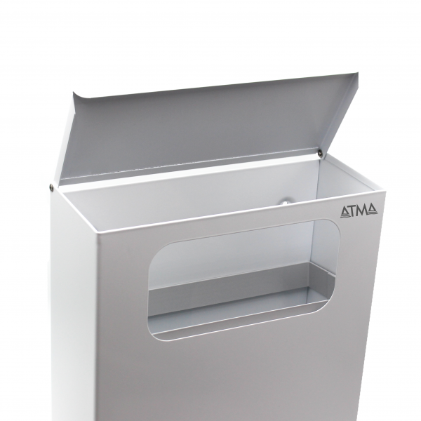 Waste bin with metal lid, capacious, designed to collect used paper towels and small debris.