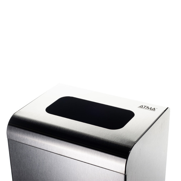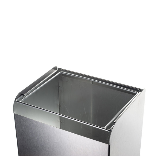 Metal urn made in Ukraine. Made from brushed stainless steel. Removable top cover. Frame for attaching the bag. Window for debris 220x120 mm. 4 anti-slip feet at the bottom of the bin. Trash bag not included
